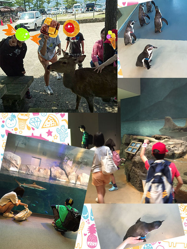 今日は宮島に今までで一番多い15人の子どもたちと行きました。 フェリーから降りてみんなでお昼を食べているとシカが近づいて来ました!おなかが空いていたんですかね!みんなでシカと写真を撮ったあと、2チームに分かれました。もみじまんじゅうチームはあんことチョコ2つずつ、4つ作りました。みんな上手に作りましたよ❗最後にお土産ももらいました! 暑かったのでそのあと、ソフトクリームを食べていると、またまたシカが来て食べられそうになるのを逃げながら楽しく食べました! 水族館チームはペンギンが歩いてお散歩をする姿や、かわいい魚たちにみんな癒されていました。じっくり見る子や何度も行ったり来たりして見る子など自分の好きな見方で楽しんでいました! 帰りには、アイスクリームやもみじまんじゅうを食べて、お土産も買って帰ることができて、とても楽しい1日になりました!!